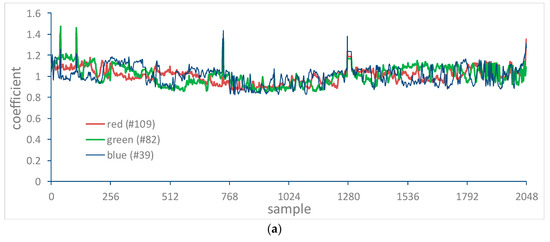 The relative radiometric calibration coefficients were derived for the SPARK-01 and -02 satellites. The results in terms of blue, green, and red bands are shown in Figure 18 and Figure 19. In total, 32 sub-regions were evident in the SPARK-01 and -02 dark current curves; this number coincides with the design, which features 32 electrical outputs. These coefficients were applied to SPARK images acquired over the calibration site in on 28 February and 7 March 2017. The non-uniformities and variations were largely eliminated after relative radiometric correction using the row-averaged curves (Figure 20).