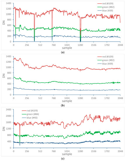Vertical striping effects were evident in the raw SPARK satellites images and were caused by several factors, such as odd-even detector processing, “smile” effects due to optical aberrations and misalignments, and signal output variations caused by electrical design. In addition, dark stripes caused by bad pixels are evident in the raw SPARK images (Figure 5). Therefore, several pre-processing steps should be conducted before the absolute radiometric calibration, including: (1) bad pixel fixing using the cross-track neighboring two pixels; (2) dark current subtraction; (3) de-smiling by cubic spline interpolation according to the pre-launch spectral calibration; and (4) relative calibration to normalize the different responses among cross-track detectors. The relative calibration procedure was applied to SPARK satellite data to correct different detector responses within a band. The dark current image and 90° yaw bright image were used to calculate the relative calibration coefficients for each detector. Then, the SPARK radiance over the calibration site was propagated to the top of the atmosphere (TOA) by using the measured ground reflectance and atmospheric parameters. The radiometric calibration coefficients were derived by dividing the predicted TOA radiance from the averaged calibration site digital number (DN) curves. Figure 12 shows the DN curves extracted from SPARK-01 and -02 data after spectral smile correction and relative radiometric calibration. These curves were derived from 6 × 6 pixel averaged values. In the next section, the reflectance- and irradiance-based methods are compared with each other.