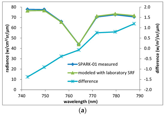 Considering the additional errors caused by the spectral fitting algorithm itself and laboratory calibration, a ±1 nm spectral shift at the 760 nm band was assumed to further estimate the influence on the radiometric calibration of SPARK satellites. The wavelength position at the 760 nm band was shifted by ±1 nm and the radiance difference was calculated for SPARK-01 and -02. As expected, the uncertainty is evident near the atmospheric gas absorption wavelengths, e.g., Fraunhofer 430 nm and 685 nm, the 760 nm and 690 nm oxygen bands, and the 720 nm, 820 nm, and 940 nm water vapor bands. The maximum value occurred for the 760 nm oxygen band. The uncertainties are less than 2% in the oxygen bands, and less than 1% in the water vapor bands if a spectral shift of −0.1 nm was ignored during SPARK satellite calibration. However, if the spectral shift was increased to 1 nm, the uncertainties would increase considerably in these atmospheric gas absorption bands (e.g., 8% by the spectral shift of +1 nm for SPARK-01 and >10% by the spectral shift of −1 nm for SPARK-02 (Figure 31). In addition, the uncertainty in the 940 nm band for SPARK-02 is higher than that of SPARK-01 due to the larger water vapor content occurring in the daytime for SPARK-02 radiometric calibration (0.35 g/cm2 for SPARK-01 versus 0.54 g/cm2 for SPARK-02).