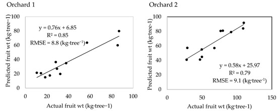 The correlation between actual and predicted total fruit weight (kg·tree−1) (Left) and fruit number with combined VIs and TCA from test set data (Right) (n = 33 from three orchards).