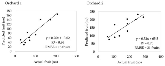 For total number of fruits, the scatter-plots between actual and ANN model predicted test set data (n = 11) were also derived for three different mango orchards in two growing seasons (Figure 8). A strong correlation was found for total fruit numbers in all three orchards across both years. Whilst a good correlation was found for all three orchards across both sampled years (Figure 7), splitting the data into 2016–2017 and 2017–2018 as training and test set produced R2 = 0.41 with RMSE = 53 fruits, R2 = 0.23 with RMSE = 69 fruits, R2 = 0.54 with RMSE = 48 fruits for orchard 1, 2 and 3 respectively. Splitting the data of two growing seasons (2016–17 and 2017–18) as training and test set, compared to combined two seasons data, again indicated an obvious influence of growing location and seasonal variation on three orchards. The highest correlation was achieved in orchard 3with R2 = 0.91 and RMSE = 21 fruits. In other orchards also, a good correlation was observed with lowest R2 = 0.73 and RMSE = 31 fruits in orchard 2. ANCOVA analysis for orchard 1 and orchard 3 showed a significant difference in both slopes and intercepts between two seasons (F = 11.8, p = 0.0016 for slopes and F = 12.4, p = 0.0013 for intercepts in orchard 1 and F = 26.7, p ≈ 0 for slopes and F = 7.02, p = 0.012 for intercepts in orchard 3 respectively). In orchard 2, there was no significant differences was found for slopes between two seasons (F = 0.05, p = 0.82) however, a significant difference was observed in the intercepts (F = 24.3, p ≈ 0).