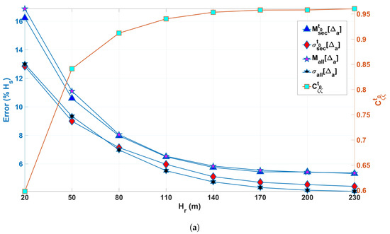In this section, the accuracy of the new wavelet based method is evaluated extensively with respect to various geometric (antenna height), environmental (bathymetry and speckle-noise level), and sea state parameters. The shadowing probability is a function of several parameters, e.g., the incident angle and variation of the surface slopes , which are functions of the range (for details refer to Appendix A). For simplification, the mean amount of shadowing is controlled solely using the radar installation height . In Figure 9a, the error () mean value and its standard deviation averaged over time and space are given using Equations (16) and (18), respectively. They are given as functions of the radar installation height both for the entire range–time map and an arbitrarily chosen cross-section. The dependence of the cross-correlation coefficient (Equation (21)) of the original and reconstructed surface elevations is also presented with respect to . The results are averaged over the nine bathymetry profiles given in Appendix B and three JONSWAP spectra (for simulation parameters details, refer to Table 1).