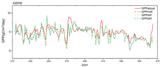 Moreover, at high temperatures at the DHS site, the estimation of GPPm is lower than the estimation of GPPs, and the difference between GPPm and GPPs increases with increasing incident PAR (Figure 8B,D). At the TMK site, the difference between GPPm and GPPs increases with increasing PAR, and reaches a maximum of approximately 70% of GPPs, which is much higher than that at the DHS site. When the incident PAR increases, the PAR reaching the understory also increases. Understory layers have higher LUE values, and GPPm is capable of considering the higher photosynthesis from understory components, which explains why GPPm is higher than GPPs. At the TMK site, GPPm is lower than GPPs when the temperature is low, which is the opposite pattern of that at the DHS site. The high temperatures at the DHS site and the low temperatures at the TMK site represent non-optimal growing temperature conditions, under which the biases between GPPm and flux tower-measured GPP are always lower than those between GPPs and flux tower-measured GPP with different degrees of variation at different sites. When the temperature enters the optimal growing temperature range, the estimation of GPPm is higher than that of GPPs, which considers the high photosynthesis capacity of the understory.