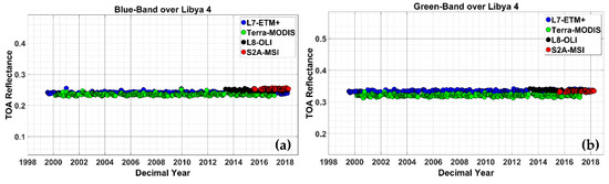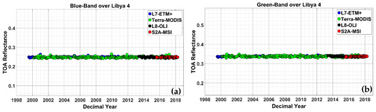 The analysis presented here suggests there is sufficient statistical evidence to conclude that with respect to common spectral band ranges among the four sensors, some of the PICS are indicating monotonic trends in some specific bands. However, these trends do not suggest that the sites are changing greatly over time. The changes detected in this analysis are generally quite small to be considered physically significant. The stability requirement of PICS based on each of the Satellite Sensor mission is an important aspect to consider. For example, the highest temporal change detected in all evaluated sites was in the Blue band for Sudan 1; the percentage change in mean TOA reflectance between the periods 1999–2012 and 2013–2018 is approximately 0.8%. This amount of temporal change may be ignored by some sensors, whereas it may not be acceptable for calibration of others due its associated uncertainties. For other spectral bands of this site, as well as for other sites, the change ranged from 0.14% to 0.65%. These changes are less than the stated mission requirements (e.g., 5% calibration uncertainty for MODIS, 2% calibration uncertainty for OLI), therefore, the evaluated sites are safely considered as a viable source of calibration. However, if any sensor demonstrates less calibration uncertainty (e.g., <0.1%), the Sudan 1 site should not be used. From this analysis, it can be stated that despite very minor changes, all of the selected PICS can be used for calibration and performance monitoring of the sensors considered in this work.
