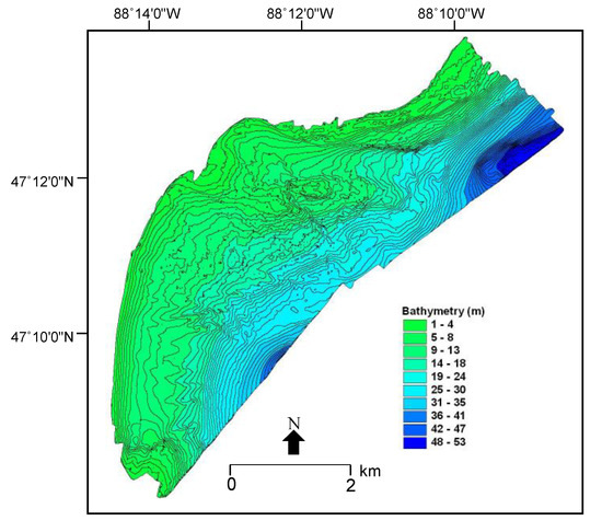 In addition to aerial photographic reconstruction of early erosion and deposition trends (up to 2008, see References [12,14,17]), mosaicked LiDAR data from multiple over-flights (2008–2016) also allowed detailed estimates of shoreline erosion and deposition. Difference calculations of underwater stamp sand bar volume, mass and movement could be measured, quantifying details of stamp sand bar erosion and deposition (e.g., [17,28]). LiDAR DEM surfaces also provided excellent bathymetric maps for hydrodynamic modeling [29]. Bottom reflectance studies of stamp sand cover could be compared with hydrodynamic model predictions. Here we discuss the nature of hydrodynamic modeling in the bay and attempt to determine modern-day quantitative stamp sand cover of Buffalo Reef. For a cross-check on the accuracy of bathymetric measurements, LiDAR-derived depths were cross-compared with the georegistered National Water Resources Institute (NWRI) SONAR-derived depths and sediment classification maps (Biberhofer and Procopec 2008). We used statistical software packages (SYSTAT, OriginPro) for determining initial spatial cross-correlations. For example, when 2008 LiDAR-derived bathymetry was compared to NWRI bathymetry, correlations were: R2 = 0.98).