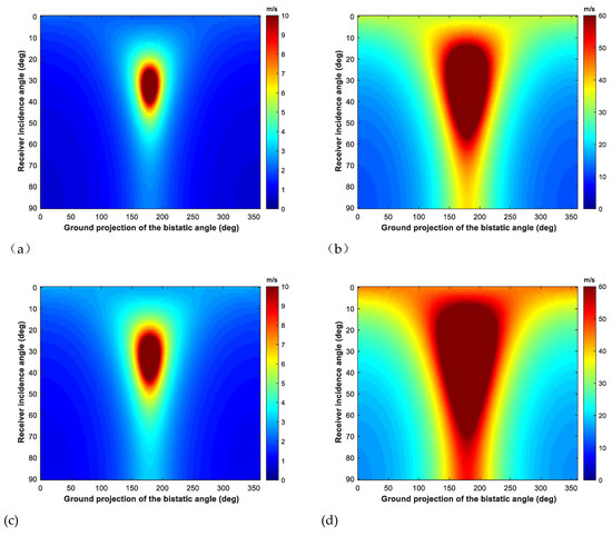 Another important MTI performance indicator is CRLB. The analytical expression of CRLB is hard to be given. We intend to adopt numerical simulation to show the relationship between the CRLB and bistatic configuration parameters. Firstly, we choose 8 bistatic configurations in Table 4 to simulate their CRLBs. Their CRLBs are shown in Figure 5, where (a) and (b) are the CRLBs for radial velocity and (c) and (d) are the CRLBs for azimuth position. It is obvious that the CRLB for radial velocity varies with and , but has little effect, while the CRLB for azimuth position is impacted by , and at the same time. Considering that CRLBs vary with radial velocity, their maximum values are used to compare different configurations’ performance. For Figure 5a,b, it can be seen that and influence the priority of these configuration according to the CRLBs for radial velocity, while hardly changes the priority but has impacts on the values. For Figure 5c,d, it can be seen that