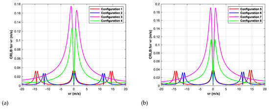According to Equations (35) and (38), the CRLB of radial velocity varies with the radial velocity. In order to compare the radial velocity accuracy for different configurations, the maximum value of CRLB is selected for comparison. It is believed that smaller maximum value of CRLB leads to better parameter estimation performance.