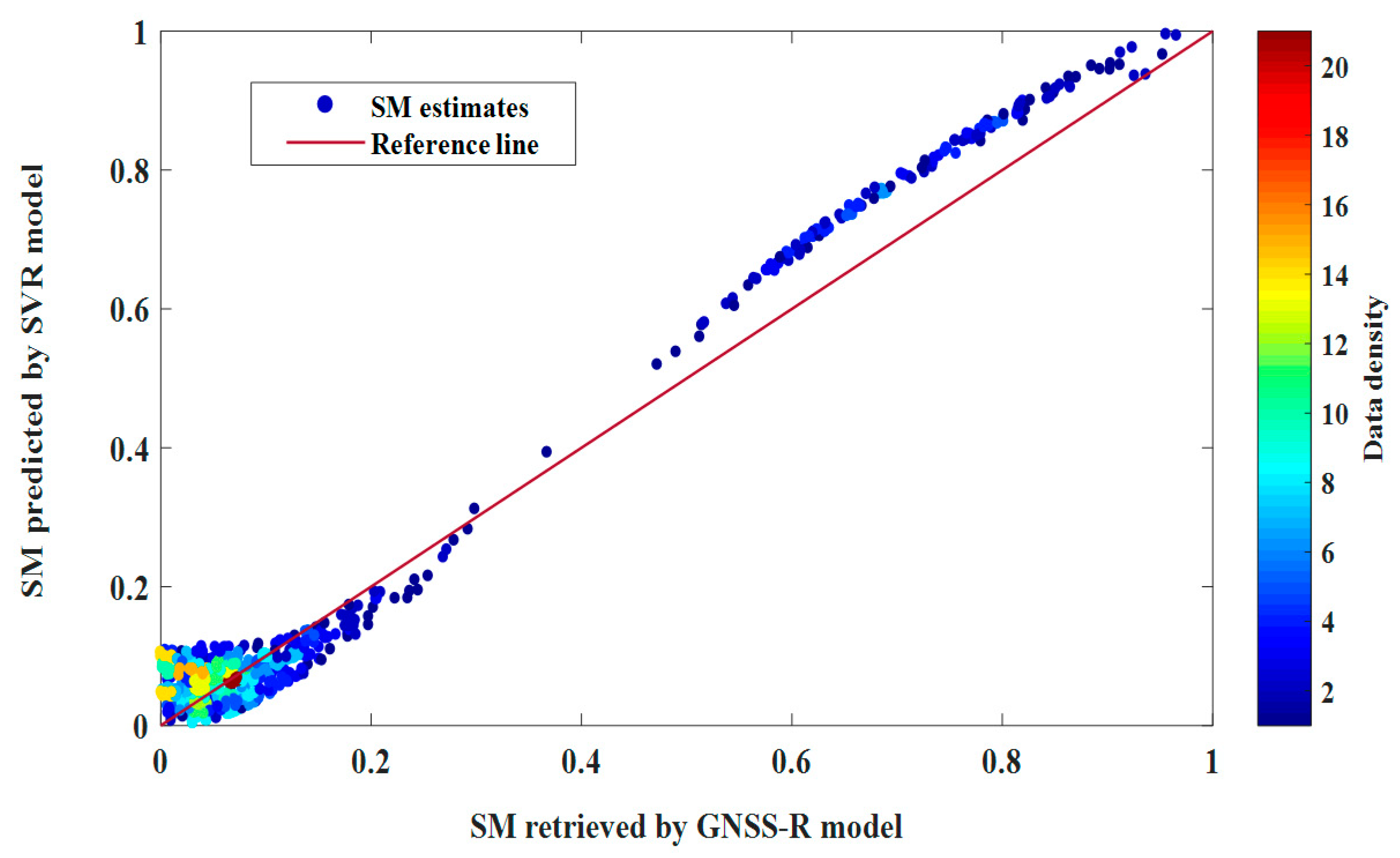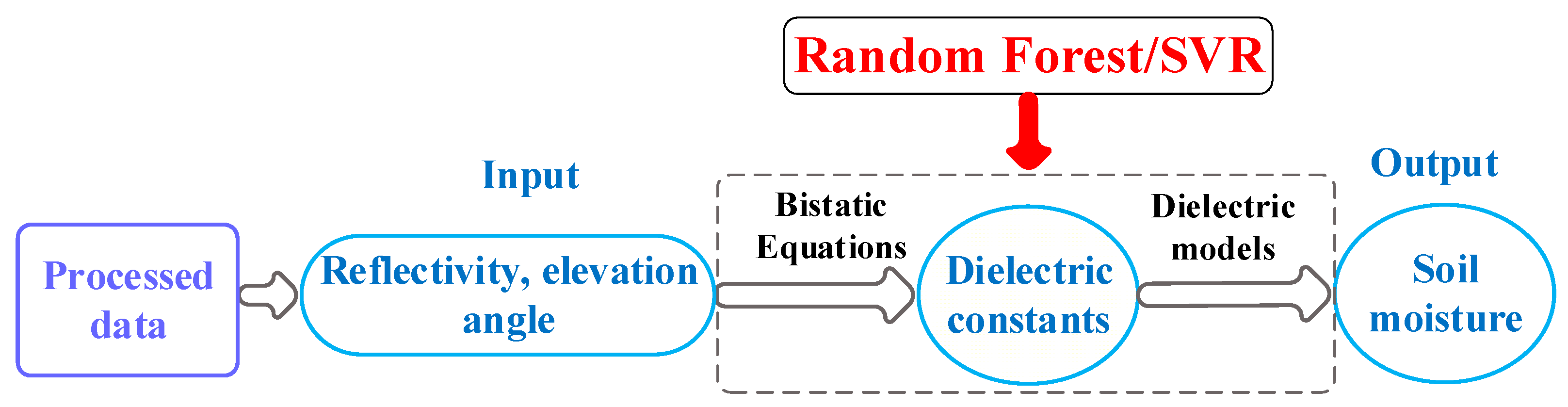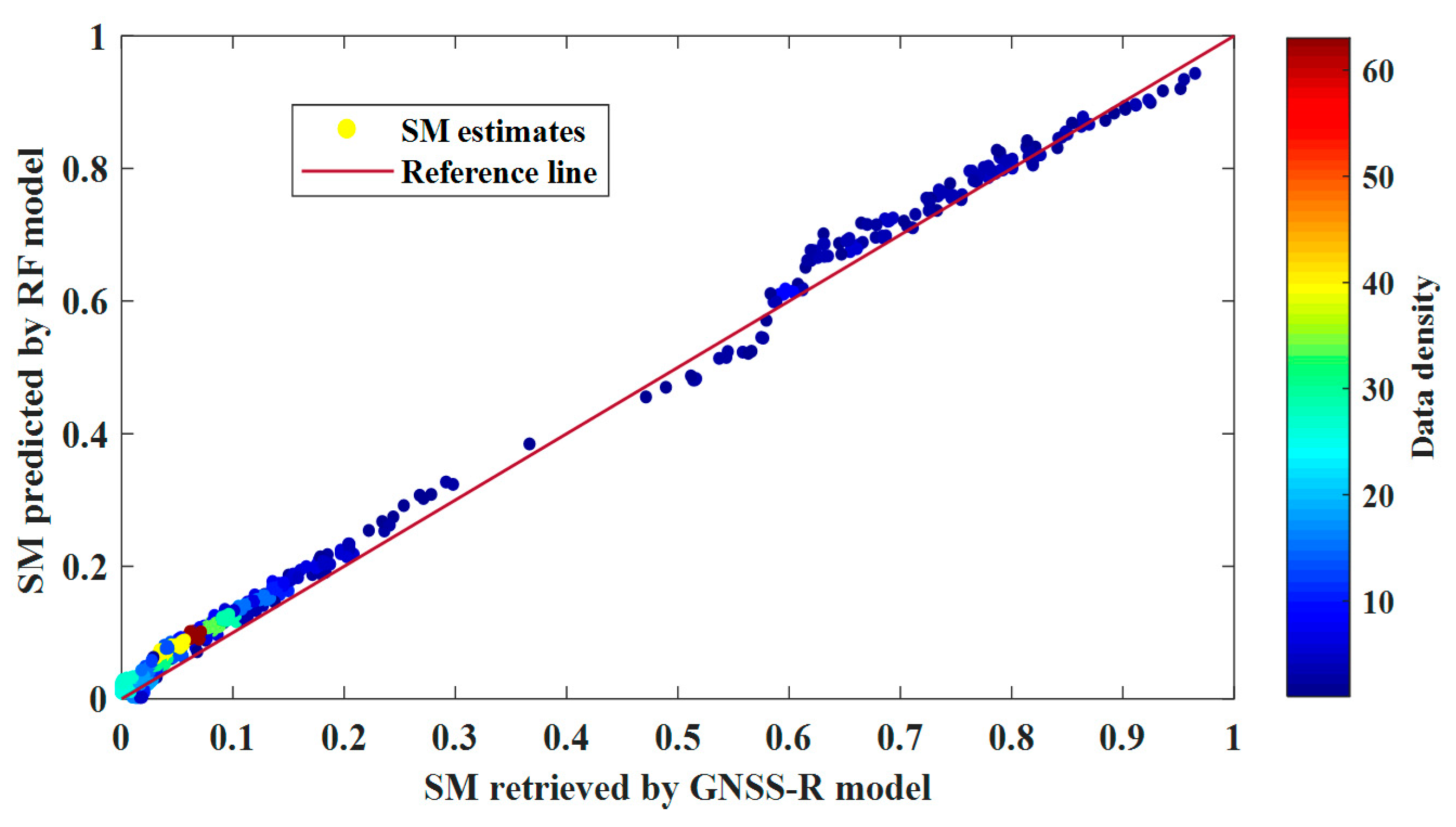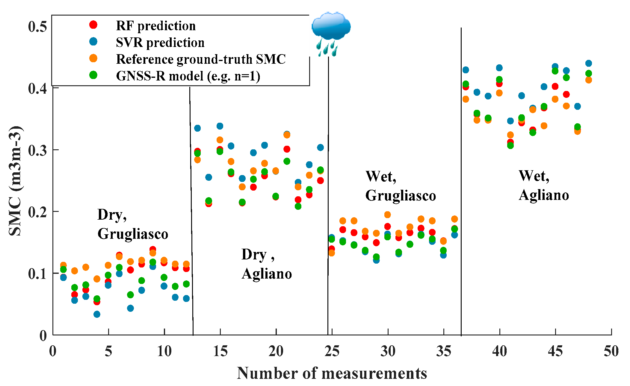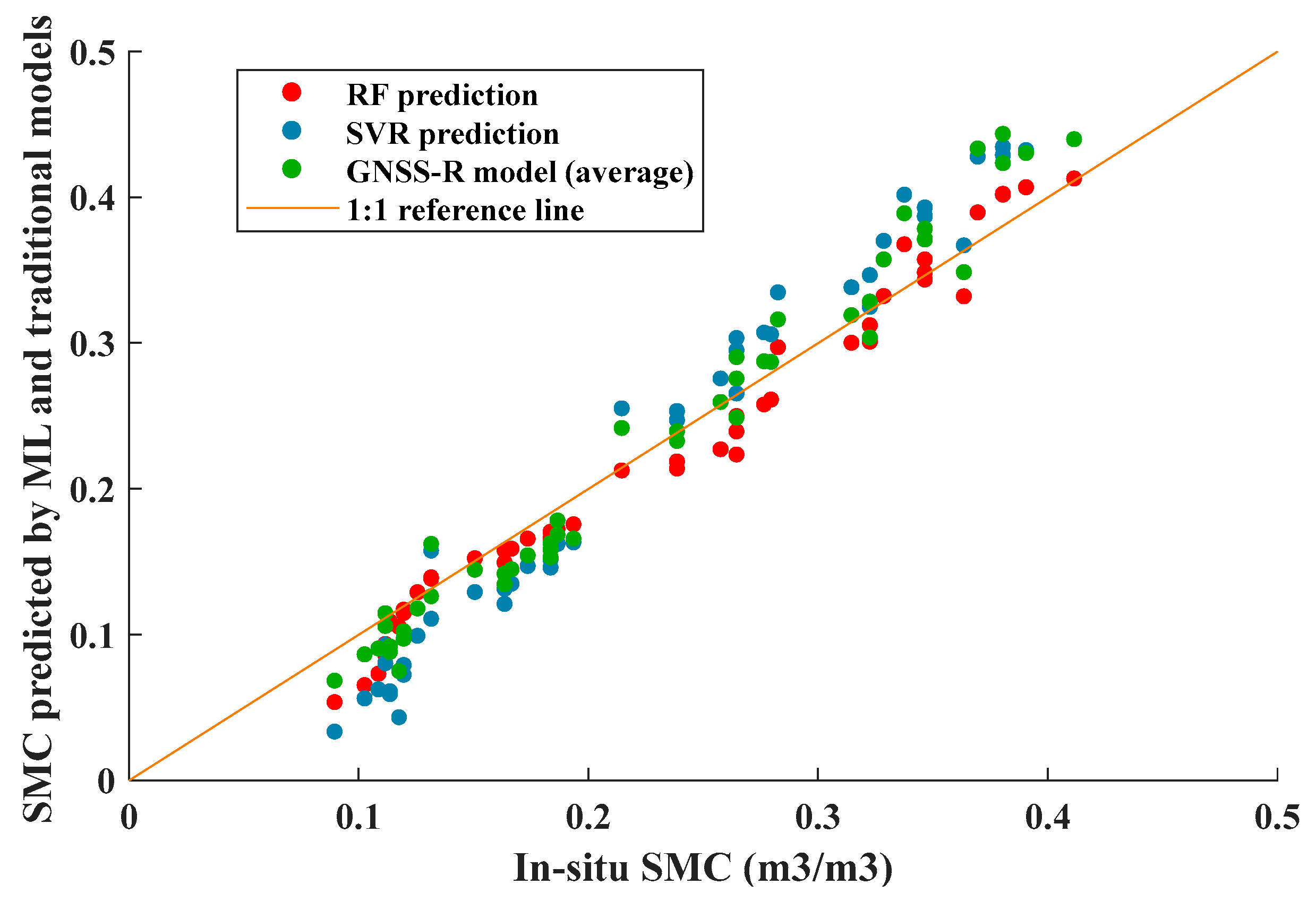 3.1. RF and SVMs Models for GNSS-R Soil Moisture Retrieval