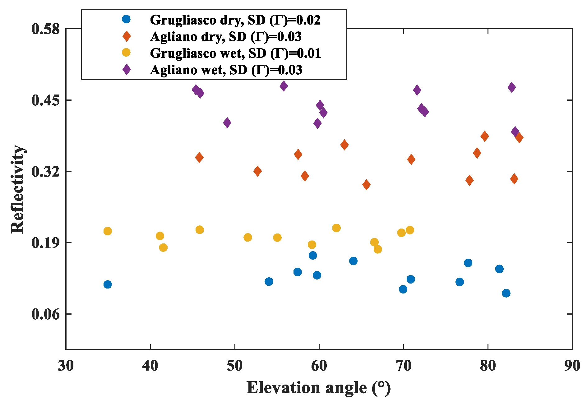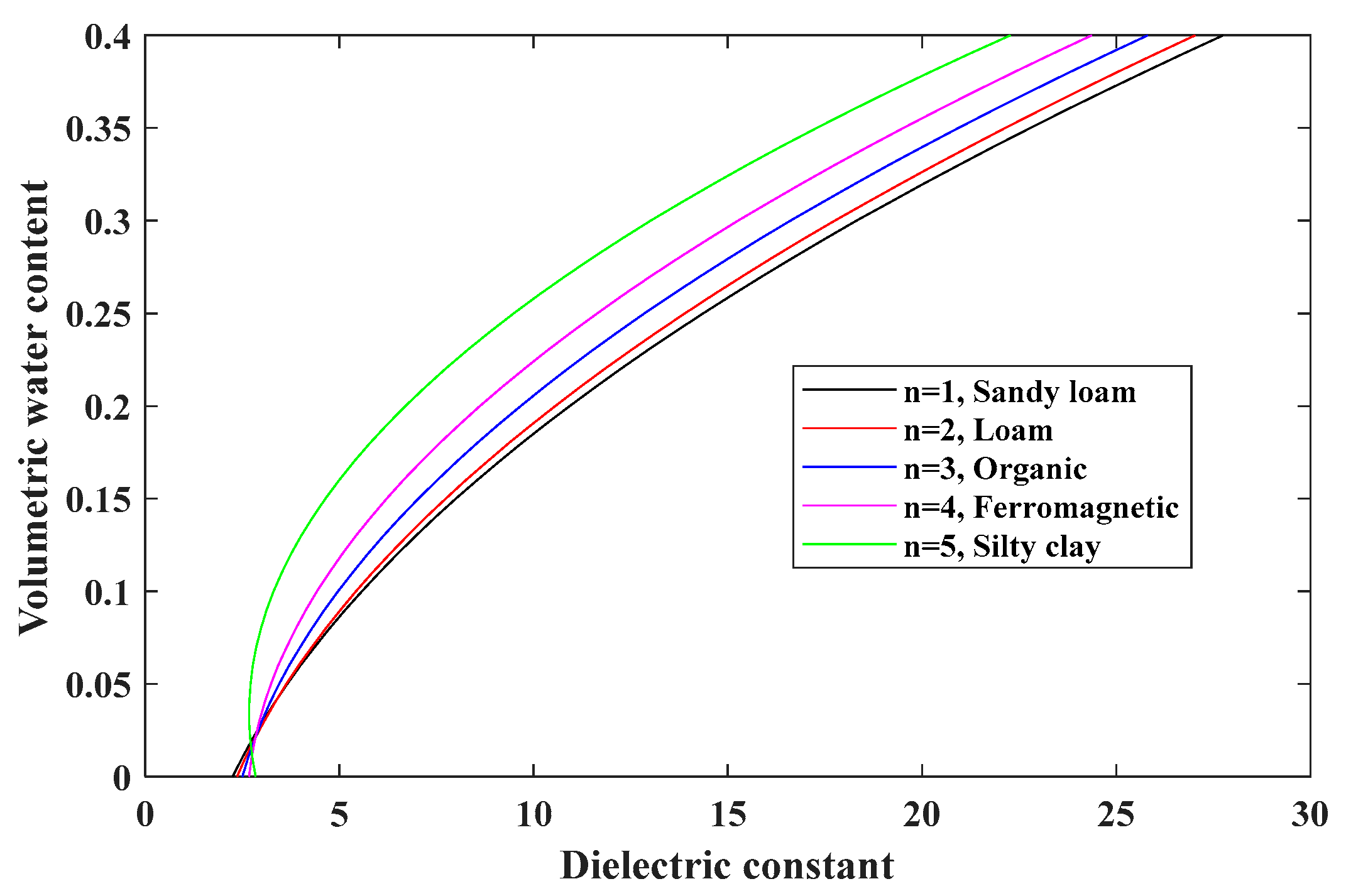 - , Dielectric constant, soils (from 1 to 25, with a step size of 1), water (78)