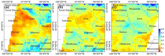 In this section, we evaluated the downscaled SM data against the in situ SM at three CVS stations in Little Washita, Fort Cobb, and South Fork. Figure 7 shows temporal comparisons among the downscaled, original, and in situ SM data. In general, both the downscaled and original SM data are in a good agreement with the in situ SM data. The agreement of both the original and downscaled SM data with in situ SM data is better in Little Washita and Fort Cobb than in South Fork. Land cover type may be one of the main causes for the performance difference [20,46]. The sites of Little Washita and Fort Cobb are dominated by the land cover of grassland, while the South Fork site is mainly covered by cropland.