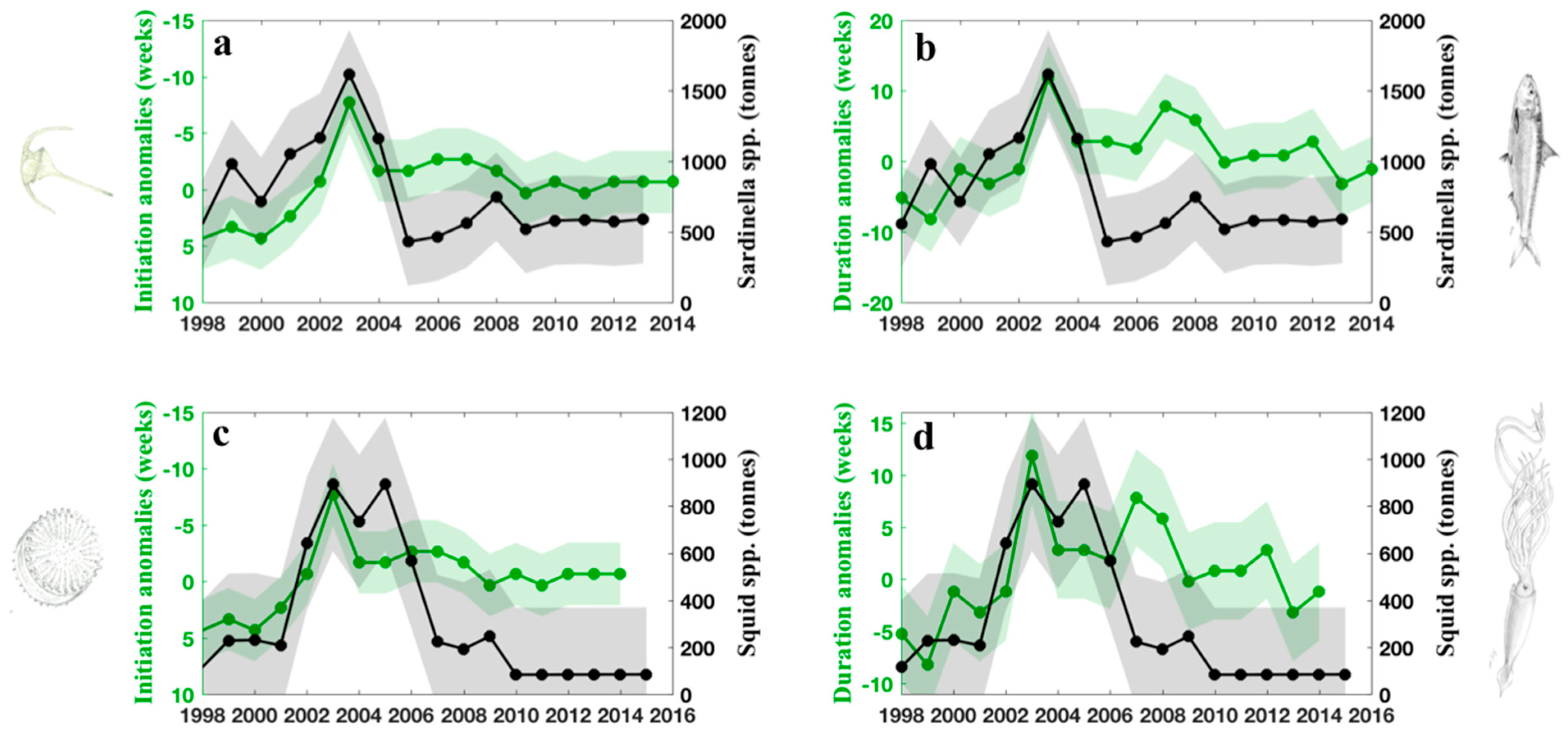 Overall, the annual anomalies of the initiation and duration of phytoplankton growth show clear negative and positive relationships with the landings of Sardinella spp., respectively (please note the reversed y-axes in Figure 7a,c). Although the correlations between Sardinella spp. and bloom initiation (r = −0.34, p > 0.05, n = 16) and duration (r = 0.23, p > 0.05, n = 16) (Figure 7a,b) are not significant at 95% level, higher (lower) landings of Sardinella spp. are observed in years when the bloom initiation occurs earlier (later). The maximum catch in Sardinella spp. in year t + 1 (2004) (~1750 tonnes more than the mean annual catch) coincides clearly with the earliest bloom initiation (~8 weeks earlier), and the longest bloom duration (~11 weeks longer), associated with the autumn/winter of 2002/2003 (year t). Significant relationships can be observed between the catch of Squid spp. and the annual anomalies of bloom initiation (r = −0.59, p < 0.05, n =18) and duration (and r = 0.48, p < 0.05, n = 18). The maximum catch of squid in 2004 also coincides with the earliest bloom initiation and longest bloom duration in 2002/2003, and remains higher for the consecutive two years (Figure 7c,d). After this, total landings decrease and fluctuate between 100–250 tonnes for the remainder of the study period.