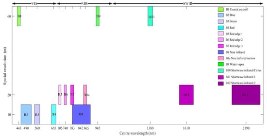 Satellites with different spatial resolutions have been used in agricultural disease identification and monitoring []. Razz et al. and Yue et al. effectively utilized the high-resolution of PlantScope imagery (3 m) to detect soybean sudden death syndrome and rice diseases, respectively [,]. Calderón et al. used high spatial resolution and hyperspectral imagery for Verticillium wilt of olive for early detection []. Yuan et al. used high spatial resolution (Worldview 2) and medium-spatial resolution (Landsat 8) satellite images to monitor the distribution of wheat disease and pest, achieving a monitoring accuracy of more than 71.0% []. Therefore, satellite imagery has proven to be an efficient tool for monitoring crop disease and pest in farms on large regional scales. The Sentinel-2 multispectral satellite launched in 2015, has a 290 km swath width and a 10 days revisit cycle, although it can reach up to 5 days if two satellites work simultaneously []. Sentinel-2 multispectral images have 13 spectral bands with a spectral range that includes visible, near-infrared, and shortwave infrared regions; their spatial resolutions are 10, 20, and 60 m, respectively (Figure 1). The most innovative feature of the Sentinel-2 satellite is that it contains rich red-edge bands information with center wavelengths of 705, 740, and 783 nm, which provides abundant information for vegetation biophysical status monitoring and estimation [,]. In summary, Sentinel-2 has an unpreceded spatial, temporal resolution and revisit cycle, which is suitable for monitoring crop growth processes such as crop diseases or pest stress [].