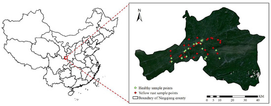 Map of Ningqiang county, Shaanxi province in China. Green crosses denote field survey locations of healthy wheat, red denote field survey locations of yellow rust-infested wheat.