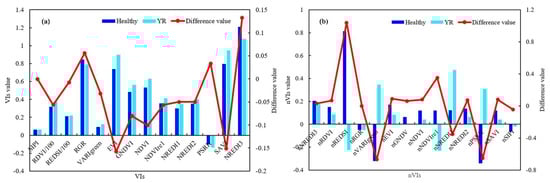 Mean and difference values for healthy wheat and yellow rust infected wheat. (a) Single—stage vegetation indices and (b) normalized two—stage vegetation indices.