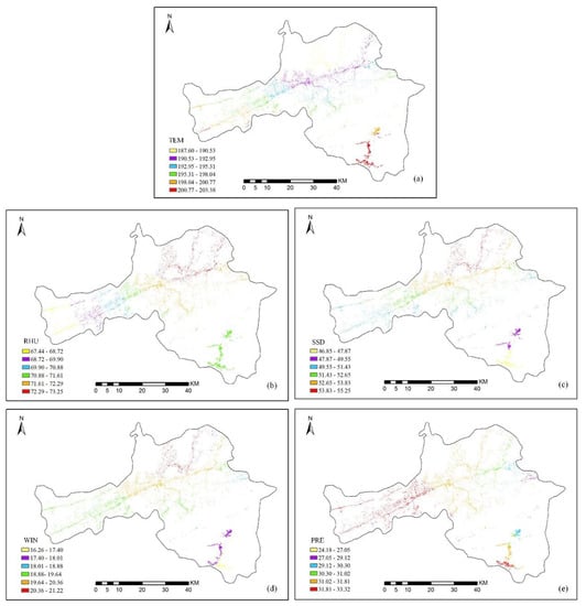 Each type of meteorological data was averaged by month to obtain its monthly average value. Then, the meteorological factors from March to May 2018 were spatially interpolated using an inverse distance weighted method in the ArcGIS software for subsequent continuous spatial pixel-scale analysis []. All meteorological factors were interpolated at a spatial resolution of 10 m, which matches the resolution of the Sentinel-2 satellite imagery. Figure 4 presents the results of meteorological data spatial resolution in May Finally, based on continuous meteorological data, meteorological characteristics were extracted for wheat yellow rust habitat monitoring.