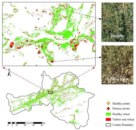 Field surveys of wheat yellow rust were conducted in Ningqiang county (118°35′19.5″ E, 37°35′51.75″ N), Shaanxi province, China from 11 May 2018 to 14 May 2018 (i.e., the filling stage, Figure 2). In Ningqiang County, wheat is a major crop, and yellow rust is the dominant wheat disease; a severe infestation occurred in 2018. The average annual temperature and precipitation of this area are 13 °C, and 1812.2 mm, respectively; low temperature and high humidity environment conditions are conductive to the occurrence, spread, and epidemic of wheat yellow rust []. Shaanxi Province is considered to be an important spring epidemic area and winter breeding area of wheat yellow rust in China []. Therefore, there is an urgent demand to monitor wheat yellow rust disease in this region.