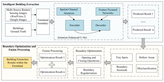 This paper proposes a method of attention enhanced U-Net for building extraction from farmland. The overall research idea is shown in Figure 1. The main content can be divided into two parts: (1) spatial-channel attention-enhanced building extraction: using the Resnet unit as the basic structure, adding a spatial-channel attention mechanism module and a multi-scale fusion module, the U-Net network is improved and the network’s attention to small-building targets is enhanced; (2) building boundary optimization and fusion processing: with remote sensing images from WorldView-2 and Google as the input, the building extraction range is narrowed under farmland boundary constraints, an improved U-Net network is employed to extract buildings for farmland, morphological filtering methods are implemented, such as opening/closing operations to optimize the extraction results, and the optimized building extraction results are fused to achieve accurate building extraction results from the farmland.