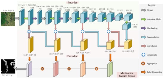 The U-Net network relies on skip connections to force the aggregation of same-scale feature maps of the encoder and decoder sub-networks, and the network performance is good. However, the types of features in the farmland are variable. These comprise not only buildings but also roads, woodlands, etc. Moreover, the building distribution is sparse, and various problems such as clouds, rain, fog, and vegetation shielding may ensue, resulting in an inability to extract small targets from complex backgrounds, incomplete building area extraction, and inaccurate boundaries. To overcome the limitations of existing methods in the extraction of small building targets within the farmland range from a complex background, this paper improves the U-Net network, as shown in Figure 2. The upper part represents the encoding structure, and the lower part represents the decoding structure. In the U-Net network coding stage, Resnet and attention models are added to enhance the network’s attention to small target buildings. Since continuous up-sampling will cause the loss of detail in the building information, this paper adds a multi-scale fusion module in the boundary stage to ensure the local detail characteristics of the buildings are retained.