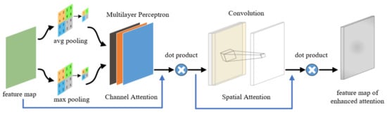 As shown in Figure 4, the attention-mechanism model designed in this paper can be used to locate the area where small building targets are scattered in a given remote sensing image and suppress useless information. First, channel attention is modeled for input feature mapping, the global average pool and maximum pool layers are processed to obtain an input feature map, and a multi-layer perceptron is constructed. The weight of each channel is automatically obtained via self-learning and is then multiplied by the input feature map to obtain a channel attention feature map. Second, spatial attention modeling is conducted, and the above channel attention feature map is applied as an input to perform the spatial convolution operation and obtain the corresponding attention weights at different spatial positions on the feature map. Then, the feature map processed by the spatial and channel mixed-attention mechanism is multiplied by the input feature map, for adaptive feature refinement. In the process of training and prediction, the model can better focus on the most important feature channels and spatial positions in remote sensing images, which thus improves the model’s detection performance.