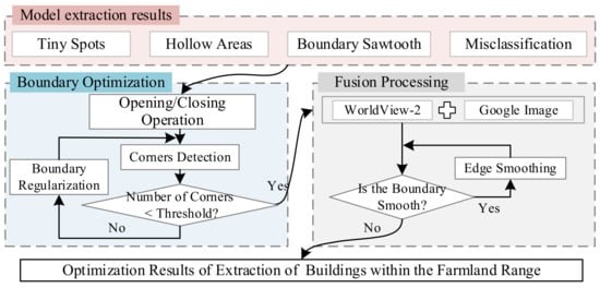 Then, based on the results of the morphological filtering operation, refer to the method proposed by Xie et al. to judge whether the number of building contour corners is smaller than the set threshold. If the set conditions are met, the multi-source remote sensing image extraction results are fused. Conversely, the building boundary should be optimized until the corner number conditions are satisfied []. Finally, the extraction results of the WorldView-2 and Google images after boundary optimization are compared pixel by pixel, and the pixels representing the building at the current location are merged as the prediction results, so as to realize the fusion processing of the extraction results of WorldView-2 and Google remote sensing images and solve the problem of misclassification in the extraction results. Gridlines are created, with the considered building outlines as boundaries. The results are further assessed to establish whether the building outline boundary requires further smoothing. If the conditions are met, the building extraction results for farmland are output. Otherwise, the boundary should be smoothed until the smoothing conditions are satisfied. The sawtooth effect in the extraction results is mitigated so that the extraction results are more precise and accurate.