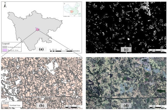 Case study experiment area. (a): Case area; (b): farmland area; (c): ground truth; (d): original images.