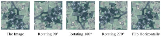 Considering that the buildings in the images are relatively small, meaningless background slices in the training set were eliminated. The 5 satellite remote sensing images were randomly divided into a training set, validation set, and test set at a ratio of 6:2:2, and the data augmentation method was applied to expand the training dataset and improve the generalization ability of the model. Through comparative experiments, it was found that the addition of Gaussian noise and color perturbation during image data processing did not encourage model accuracy improvement. Therefore, the image processing procedure only involved rotation and flip operations, so that more morphological building features could be recognized, as shown in Figure 8. Finally, 6238 training sets, 2301 verification sets, and 1637 test sets were obtained, and no overlap occurred between the training data and test data.