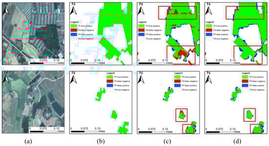 As shown in Figure 9, the results for the buildings extracted using the attention-enhanced U-Net model proposed in this paper showed that our model can effectively extract buildings within the scope of farmland. However, the buildings in the dataset are scattered and staggered in the farmland, which leads to the problems of unclear edges and holes at certain map locations, as shown in Figure 9c. With the application of boundary optimization and data fusion methods, the building extraction results are optimized, as shown in Figure 9d. Comparing the red boxes in Figure 9c,d, we can observe that the building pattern in Figure 9d contains no small holes and that the boundary is smooth. In particular, the optimization process can eliminate the very small spots previously found in the extraction results and smooth the boundary, so as to obtain a more complete extracted shape and clearer boundary, respectively.
