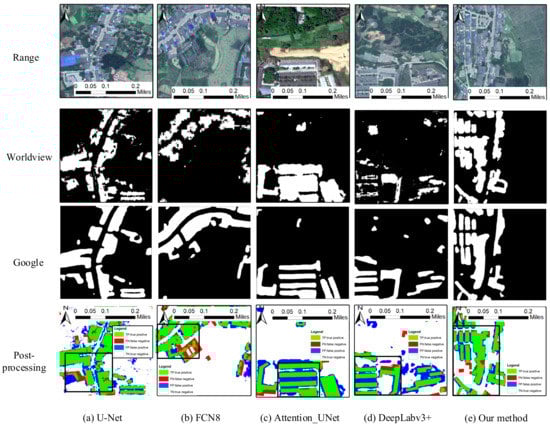 The results of building extraction using the method proposed in this paper, FCN8, U-Net, Attention_UNet and DeepLabv3+ are shown in Figure 11. According to Figure 11a, there are a large number of small spots showing wrong detection in the U-Net fusion result, and the missed detection is serious. According to Figure 11b–d, the FCN8 fusion presents obvious areas of missed detection. Meanwhile, the fusion results of Attention_UNet and DeepLabv3+ demonstrate obvious false detection areas around the boundary of the building’s block. According to Figure 11e, compared with the other four network models, the fusion processing results of building patches extracted by this method account for the most positive inspection areas, and the building patches are more complete; that is, the fusion processing can eliminate the fine patches in the results and smooth the edges of the patches.