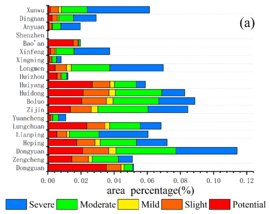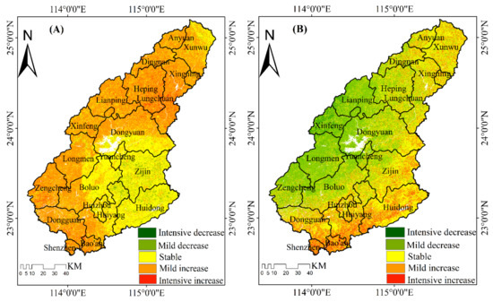 We calculated the spatial distribution of the EV change intensity in 2001, 2008, and 2019. Then, we differentiated the vulnerability maps for the three years (2001, 2008, and 2019), and the spatio-temporal changes in EV in the DRB were further analyzed. On the basis of the histogram distribution and related spatio-temporal map changes, the four stages of EV change intensity (CI) were classified as follows: decreasing intensity (CI ≤ −0.20); mildly decreasing (−0.20 < CI ≤ −0.1); stable (−0.1 < CI ≤ 0); mildly increasing (0< CI ≤ 0.1); and intensity increase (CI > 0.1). We used the ArcGIS zonal statistics tool to calculate the average of each factor for each district and county and combined it with Figure 6. The results show that, from 2001 to 2008 (Figure 6A), the DRB was dominated by two intensities, i.e., mild increase and stable, with mild increase occupying more than half and stable mainly distributed in Huidong, Zijin, Huizhou, Yuancheng, Dongyuan, and Boluo. From 2008 to 2019 (Figure 6B), mild decrease was mainly distributed in Zengcheng, Boluo, Longmen, Lianping, Dongyuan, and Yuancheng, etc., and mild increase dominated in Shenzhen, Dongguan, Huiyang, Huizhou, and Huidong in the southern DRB. The quality of the environment has improved over the last 20 years in the DRB, with a trend towards increased EV in a few areas, these being more obvious is the southernmost part of the DRB (Figure 6C).