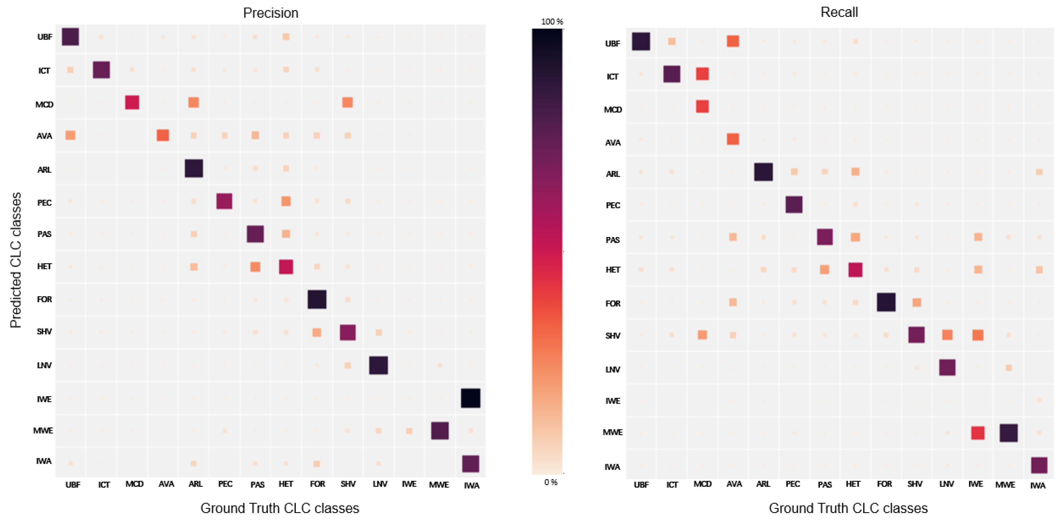- Urban Fabric, Arable land, Forest and Open spaces with little or no vegetation achieved a very high F1-score with, respectively, 0.84, 0.89, 0.91, and 0.82 values.