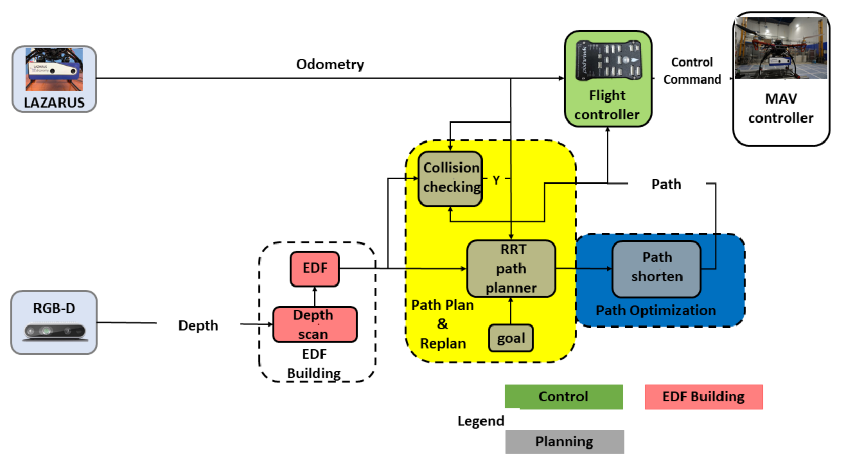 - Lu, L.; Sampedro, C.; Rodriguez-Vazquez, J.; Campoy, P. Laser-based collision-avoidance and Reactive Navigation using RRT* and Signed Distance Field for Multirotor UAVs. In Proceedings of the 2019 International Conference on Unmanned Aircraft Systems (ICUAS), Atlanta, GA, USA, 11–14 June 2019; pp. 1209–1217. [Google Scholar]