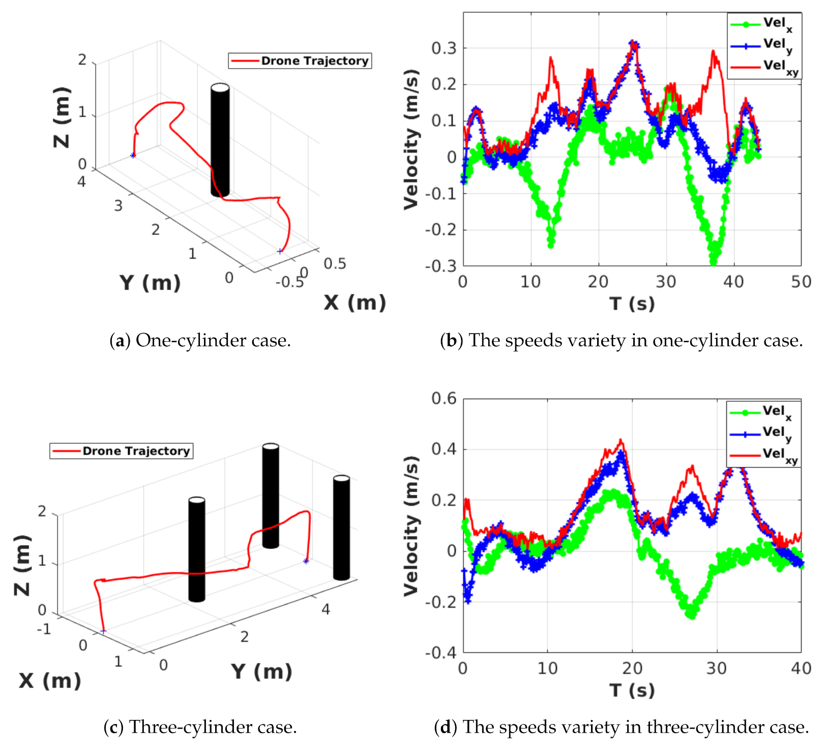There are two different cases designed for real flight experiments. One is a one-cylinder case and the other is a three-cylinder case. The start points of these two scenarios are (0, 0, 0), while the endpoints of one cylinder and three cylinders’ environments are (0, 4, 0) and (0, 5, 0), respectively. The maximum velocities in the one cylinder and three cylinders cases are 0.32 m/s and 0.44 m/s. Figure 7a,c show the trajectories of these two experiments, while Figure 7b,d show how the velocities vary during the experiments.
