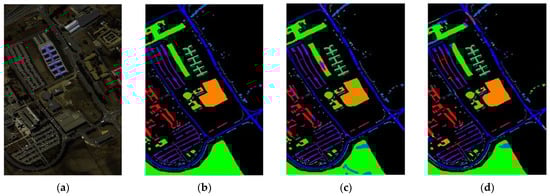 This paper first introduces three available HIS datasets and then discusses the setting of related parameters. Specifically, the method of selecting training samples is what percentage is taken for each category, while the specific land cover types, training, and test sets are shown in Table 1, Table 2 and Table 3. Then, we challenge the proposed model against other methods, including Edge-Preserving Filtering (EPF) [], Image Fusion and Recursive Filtering (IFRF) [], RP-Net [], CNN-AL [], and SS-RMG [].