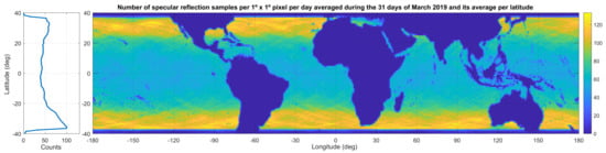 in which I is the signal’s intensity or, in our case, the magnitude of the Signal-to-Noise Ratio (SNR) of the Delay-Doppler Map (DDM) of the reflected signal over oceans in linear units, and its average () is calculated over a 10 s moving window. This way, global maps can be elaborated on calm oceanic regions between 40ºS and 40ºN latitudes.