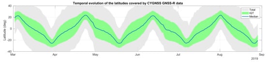 Due to the periodicity of the CYGNSS satellite’s orbits, and the filter applied to keep only measurements from 0 h to 6 h LT, a time dependence was observed in the latitude of the regions covered by the study along the period studied.