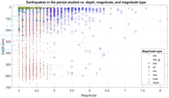 In the USGS database, each earthquake in the period studied is given by a single magnitude type [], but, as stated before, they are all designed to be consistent. This is why, in our study, the magnitude provided is used for all the earthquakes, without taking into account the magnitude type. Table 1 shows the relative abundance of each magnitude type in the period studied: