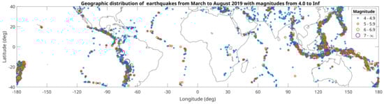 Figure 4 shows the position of all the earthquakes occurring in the six months studied, from March to August 2019. Please note that the color scale and size of the circles represent their magnitudes. It is important to remark that most of them happen in the middle of the oceans, near the faults between tectonic plates. With the method presented here, only these earthquakes in oceanic regions or near the shore can be monitored, because the land reflectivity is highly variable, and the possible ionospheric scintillation would become masked. For example, the largest earthquake in the period studied, with a magnitude of 8.0, on 26 May in Peru, was located on land, 500 km away from the closest seashore, which is larger than the maximum distance considered in this study.