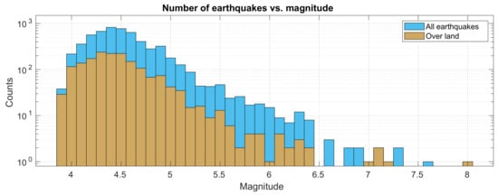 The total number of earthquakes that took place in the period studied is 6108, and 29.4% of them are located on land, but many of them could happen on small islands or very near the shore so they are included. Figure 5 shows a histogram for all the earthquakes in the period (blue bars), and only the ones happening on land (in brown), as a function of their magnitudes. Please note that the vertical scale is in logarithmic scale to see the larger magnitude intervals, where only a few earthquakes occur.