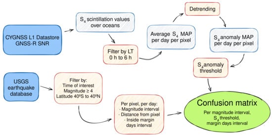 Finally, the ionospheric scintillation variation data and the occurrence of earthquakes, are analyzed to assess the correlation of their mutual occurrence, and the confusion matrix is computed. The overall process is shown in the diagram in Figure 6.