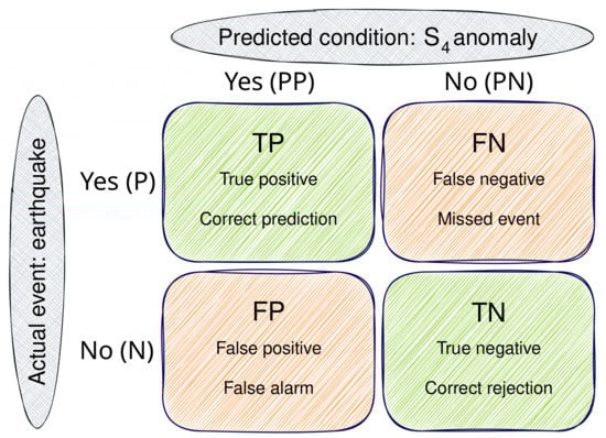 A confusion matrix (CM) is the usual way to study the effectiveness of an algorithm to detect an event. It is a 2 × 2 matrix classifying the events according to two binary classes: the predicted ionospheric scintillation signature, and the actual occurrence of the earthquake. This classification results in four possible cases, as depicted in Figure 7.