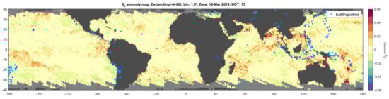 The image shows the results of the detrended values for the selected day over oceanic regions with the values ranging from −0.06 to 0.06 as indicated in the color scale. Blue stars mark the epicenter of all earthquakes happening during the period from −6 days to +6 days from the current day 16 March.