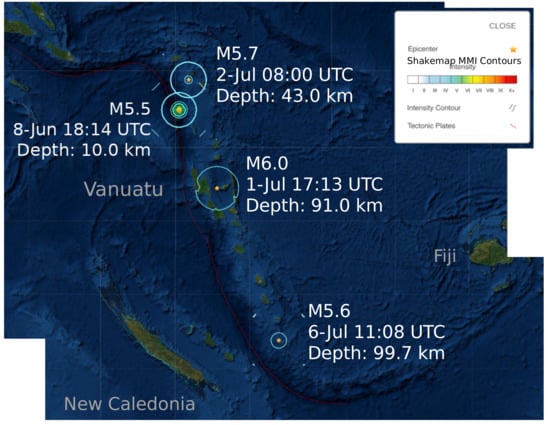 A case in which some positive variations in the index are distributed around an earthquake cluster occurred at the beginning of July 2019, in the oceanic region of Vanuatu’s archipelago. Vanuatu is a group of islands of volcanic origin that formed after the subduction of the Australian plate under the Pacific plate, which makes this region suffer from large recursive earthquakes []. Some of the largest earthquakes from the cluster mentioned are shown in Figure 10, indicating their magnitudes, UTC times, and depths. Please note that all of them are located eastward of the fault, where the subduction takes place. The circular curves around the earthquakes indicate the shakemap Modified Mercalli Intensity (MMI) contours, which are defined from I to X measuring the intensity of the effects produced on the surface.