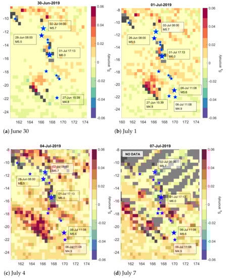 variations maps for selected days around Vanuatu islands at the beginning of July 2019, with a resolution of 0.5º per pixel. Stars represent the earthquakes’ epicenters with magnitudes in the period from −6 to +6 days from the current day.