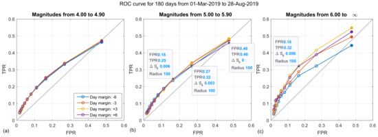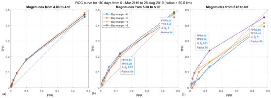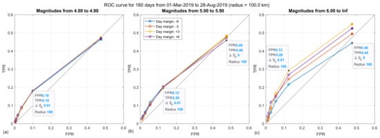 Similar results show the ROC curves in Figure 14 and Figure 15, which have been drawn using a coarser interval. In this case, for the 50 km radius and magnitudes larger than 6 (Figure 14c), we observe that only the one corresponding to the is separating from the main diagonal. Here we can see that the correlation is less when the radius decreases from 100 km to 50 km.