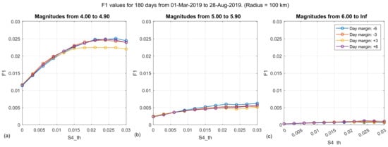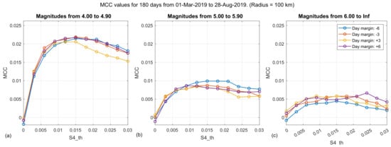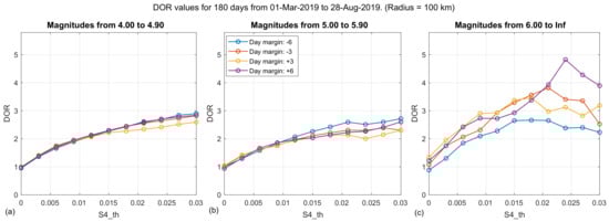 An interesting conclusion that can be extracted from the two most significative statistical parameters (DOR and MCC), is the value of the ionospheric scintillation threshold () parameter that is giving the best performance when correlating earthquakes with positive variations. As observed in Figure 16a,b for small magnitude intervals (from 4 to 6), using the DOR metrics, is larger than 0.03 (the largest value swept), but it is close to 0.02 for magnitudes larger than 6, in Figure 16c. For example, the values previously shown in Table 4 correspond to the yellow line (: +3 d) in Figure 16c, which has a peak for a .