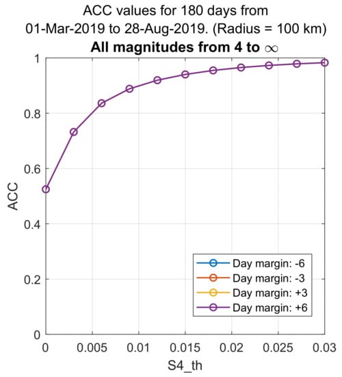 Another metrics computed is the accuracy (ACC) using Equation (4), which is shown in Figure 17 for the 100 km radius case. The problem with this indicator for very unbalanced classifications such as this is that they will give unrealistically high values because they are only accounting for the TP and TN counts with respect to the total TOT. It is observed in the plot that it goes from 50% accuracy to almost 100%, and all the curves are overlapping in the one shown here, for all , and all magnitude intervals. In this case, as the number of Positives (P) and Negatives (N), i.e., earthquakes vs. no-earthquakes, is very unbalanced, the accuracy is not a good indicator of correlation.