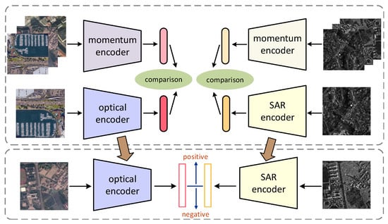 As ImageNet pre-training can hardly improve the learning ability for SAR images, the representation learning ability to match models plays a vital role in SAR-optical matching tasks. Recent advances in self-supervised learning for computer vision present competitive results with supervised learning. Without manual annotations, useful representations can be obtained only with the help of some pretext tasks, which is probably achieved by maximizing the mutual information of learned representations. Representations pre-trained by contrastive learning that transferred to downstream tasks: classification, segmentation, and detection tasks lead to a competitive performance with supervised learning [,,,,,,]. A contrastive learning method called Momentum Contrast (MoCo) [] uses a momentum-update encoder to generate a dynamic dictionary query to save more negative samples with less memory. The MoCo pre-training method has achieved promising results in a variety of downstream tasks.