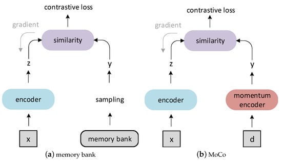 - He, K.; Fan, H.; Wu, Y.; Xie, S.; Girshick, R. Momentum contrast for unsupervised visual representation learning. In Proceedings of the IEEE/CVF Conference on Computer Vision and Pattern Recognition, Seattle, WA, USA, 13–19 June 2020; pp. 9729–9738. [Google Scholar]