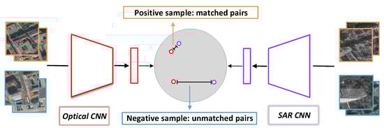 Despite the different modalities of SAR and optical images, BNN [] works like a bridge and is capable of projecting the multimodal images into a common representation subspace. As depicted in Figure 4, given a SAR-optical image dataset . are sets of SAR and optical image patches. We construct the positive sample set , where corresponding image pairs are from the same region. Image pairs from are from different areas, which we call negative samples. The dual networks respectively extract features from SAR and optical images: is for features of SAR images while for optical images. The separate networks reduce the images into the n-dimension latent vectors: . Then, Euclidean distance is designed to bring the latent representations of positive samples together while pushing negative samples apart in the common representation subspace. The Euclidean distance between and is defined as: