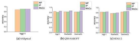 Accuracy performance.Table 2 and Table 3 suggest that our MoCo pre-trained models lead to a better matching performance on QXS-SAROPT and SEN1-2.(The bolded number represents the highest score on the backbone.) Especially on QXS-SAROPT, the accuracy of BNN taking MoCo as a pre-training strategy achieves and and makes a 4.4% improvement, which surpasses the other two methods by large margins. MoCo pre-training also makes an obvious improvement on SEN1-2, indicating that MoCo has a powerful representation learning ability for both SAR and optical images. Furthermore, the results of NP and IP with ResNet50 and Darknet53 as backbone are almost the same, which illustrates that the ImageNet supervised pre-trained models have no capacity for SAR information and characteristics and it hardly makes sense in the SAR-optical image matching problem. It is worth noting that IP-BNN is even worse than NP-BNN with Vgg11 as a backbone on QXS-SAROPT and SEN1-2, which is in line with the claims made in [], i.e., shallow models can be trained from scratch as long as a proper initialization is used, whereas only when the network is large enough can the ImageNet pre-training model which contains prior knowledge provide a good initialization to fine-tune. Besides, in Table 1, MoCo does not make any progress on SARptical. The reason may stem from the single building scenario in this dataset; the IP method learns better optical features and makes a great performance. When confronted with more complex SAR-optical datasets, optical feature embedding ability is weakened and SAR feature learning ability plays a major role. We visualize the accuracy results in Figure 5 to better show the comparison of the different pre-training strategies.